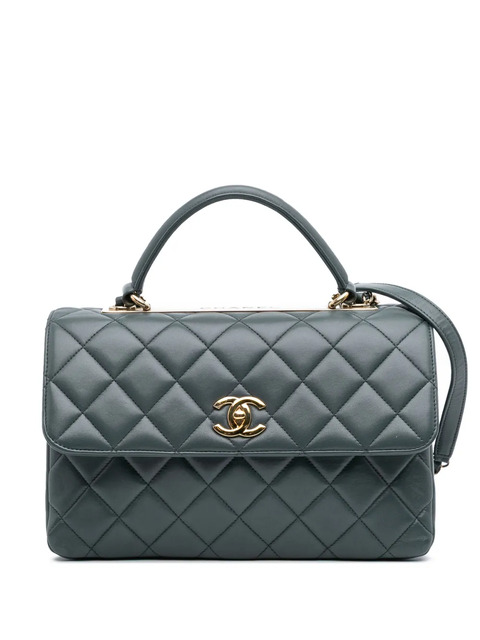 quilted lambskin leather body flat leather top handle detachable leather woven chain strap front flap with CC turn-lock closure exterior back slip pocket interior zip and slip pockets gray Serial Number: 26251178 Inclusions: shoulder strap. Condition: EXCELLENT. This previously owned item is in near-perfect condition with no signs of damage or use. Please refer to the photos on this product page for a detailed view of the item, including any damages declared.