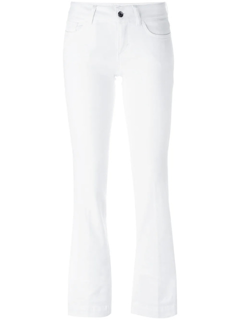 White stretch cotton flared jeans from Dolce & Gabbana featuring a mid rise, a waistband with belt loops, a button and zip fly, a five pocket design, a leather brand patch to the rear, a flared style and a regular length.