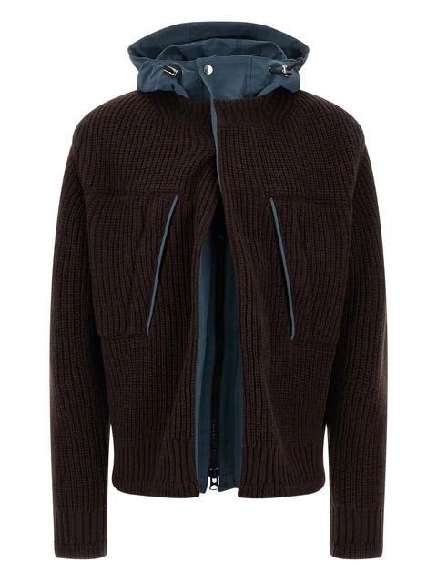 brown ribbed knit concealed zip fastening two welt pockets detachable hood contrasting inner layer