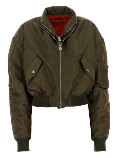 olive green front zip closure side flap pockets ribbed cuffs elasticated hem