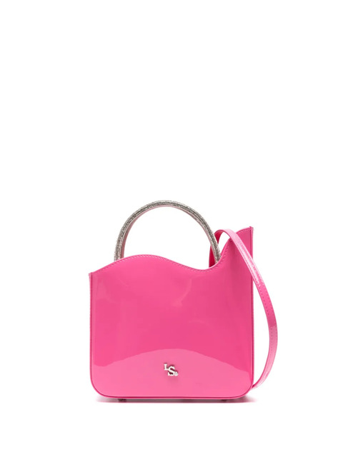 deep pink leather patent finish asymmetric design silver-tone logo plaque crystal embellishment top handles concealed magnetic fastening adjustable detachable shoulder strap main compartment silver-tone hardware logo-jacquard lining metal feet