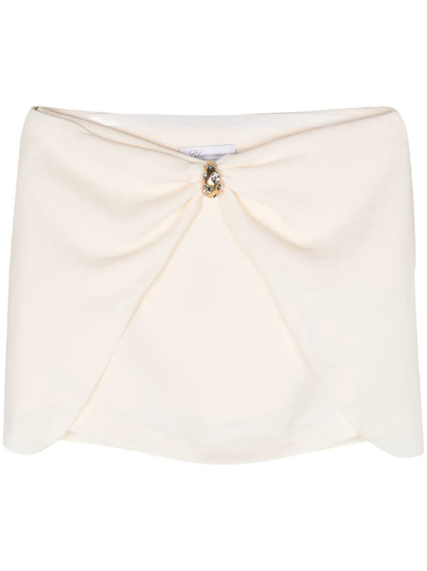 light beige crepe texture appliqué detail gathered detailing rhinestone embellishment low-rise concealed side zip fastening straight hem thigh-length unlined