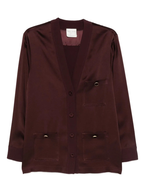 dark brown satin texture button fastening V-neck welt pockets metallic button embellishment