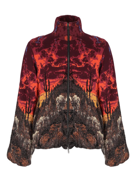 red/multicolour knitted construction zip fastening high neck patterned jacquard