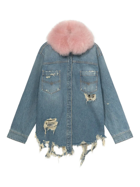 light blue front patch pockets faux fur collar frayed hem distressed details long sleeves