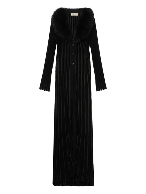 black ribbed knit faux-fur collar button front long sleeves floor-length
