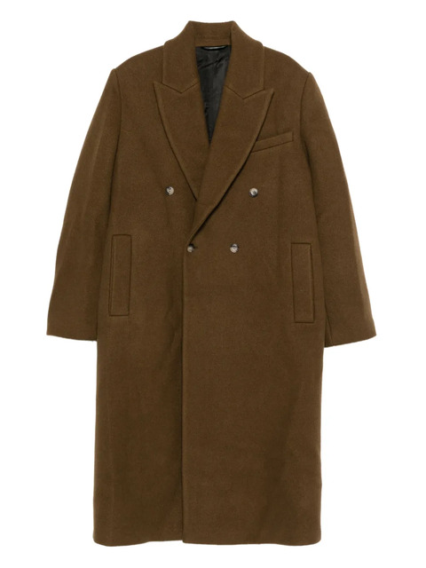 brown double-breasted fastening padded shoulders side pockets long sleeves centre back vent