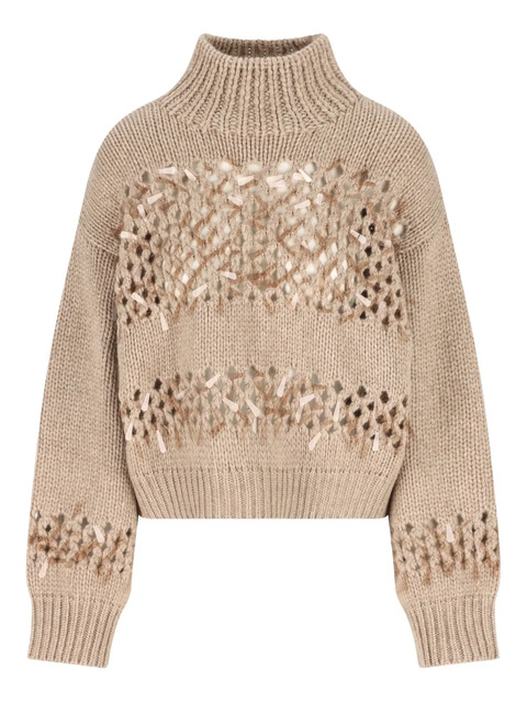 brown openwork areas high neck ribbed trim