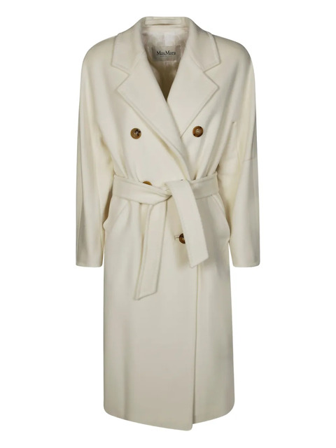 white double-breasted button fastening belted waist notched lapels front flap pockets