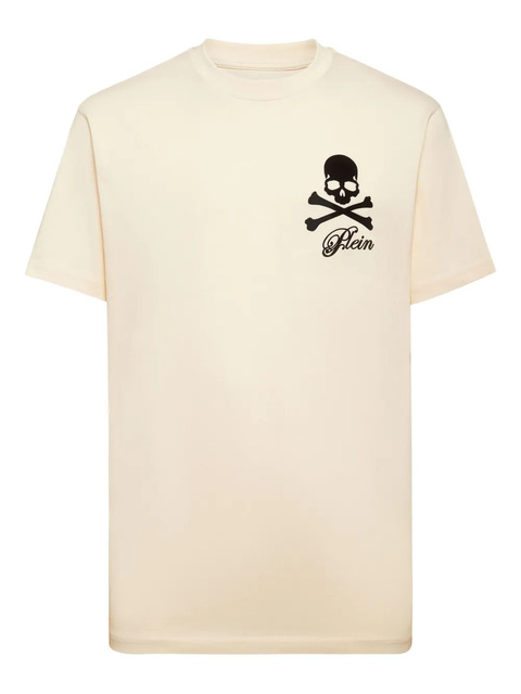 cream front skull and crossbones print logo lettering short sleeves crew neckline back logo detail