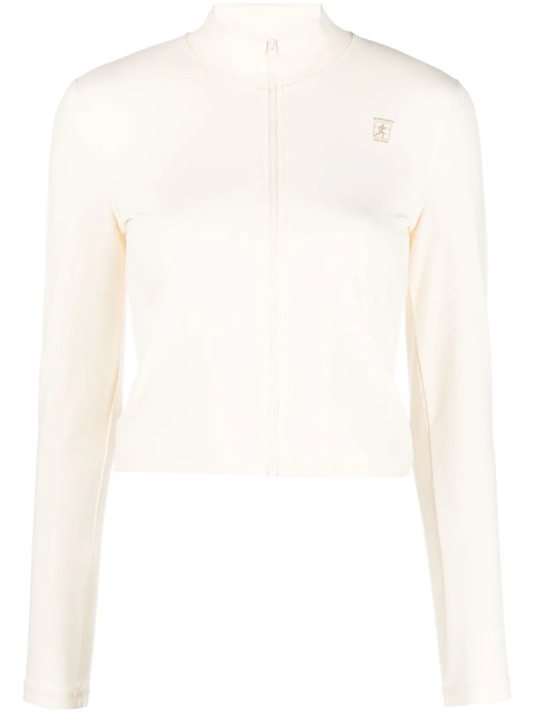 cream white stretch-jersey matte finish rubberised logo detail tonal stitching stand-up collar front zip fastening long sleeves cropped straight hem tonal hardware