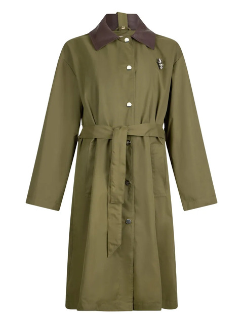 olive green contrasting collar jewel embellishment button fastening self-tie belt hooded neckline
