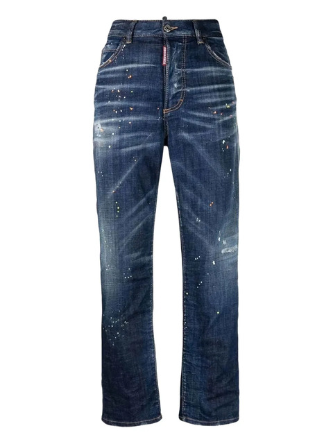 navy blue cotton blend distressed effect paint splatter detailing five pockets belt loops