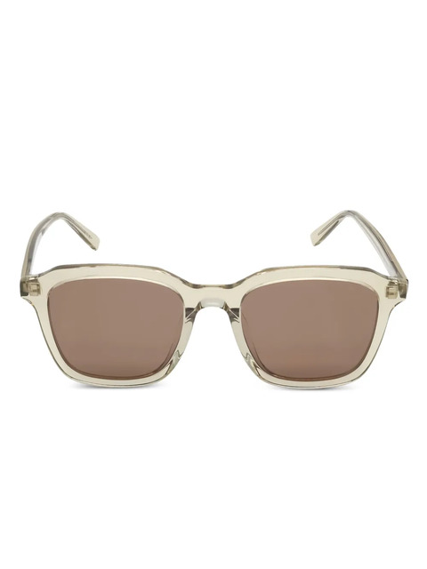 grey square frame tinted lenses logo lettering These glasses come with a protective case.