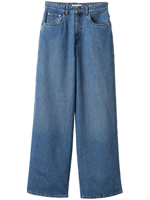 indigo blue/camel brown cotton washed denim embroidered logo to the rear decorative stitching mid-rise belt loops wide leg concealed fly and button fastening classic five pockets straight hem