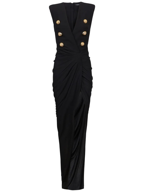 black crepe texture fitted waistline plunging V-neck decorative button detailing draped skirt rear zip fastening front slit sleeveless