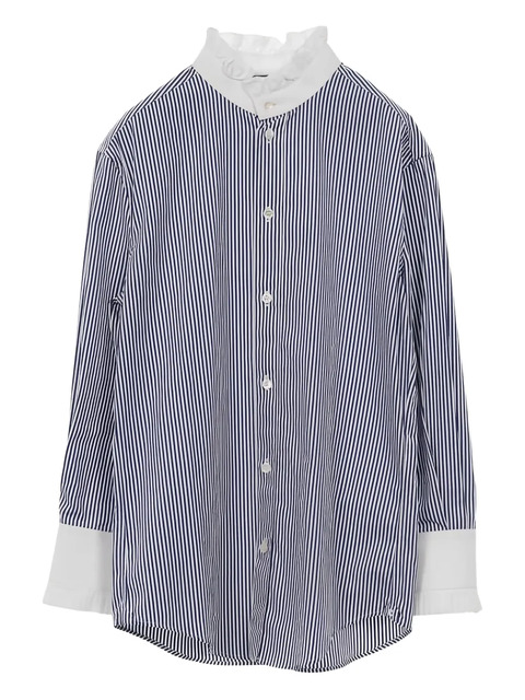 2010s blue stripe pattern frill detail stand collar long sleeves button fastening