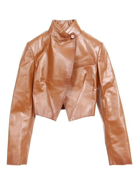 2020s brown leather button fastening high neck long sleeves chest pocket