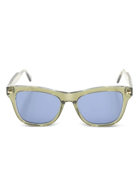 2020s green geometric frame tinted lenses gold-tone detailing logo lettering nose pads These glasses come with a protective case.