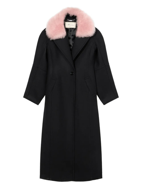 black faux fur collar in pastel pink double-breasted front side slits tailored long sleeves relaxed silhouette