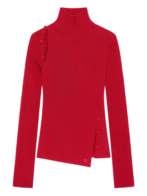 red ribbed texture turtleneck neckline asymmetric hem button embellishment
