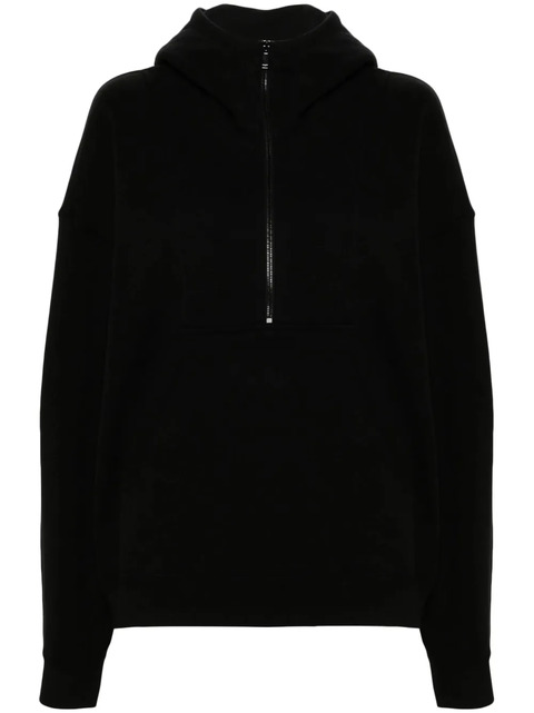 black cotton jersey texture embroidered logo classic hood half front zip fastening drop shoulder long sleeves ribbed cuffs and hem front pouch pocket straight hem fleece lining