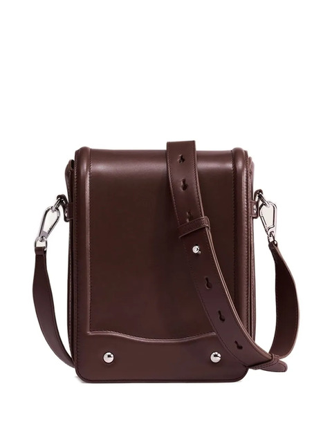 pecan brown leather silver-tone studded closure adjustable strap logo engraved
