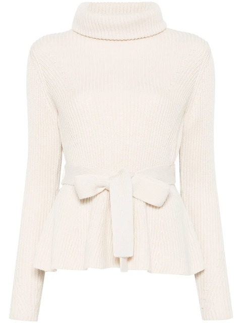 light beige wool ribbed knit roll neck long sleeves tied waist peplum hem