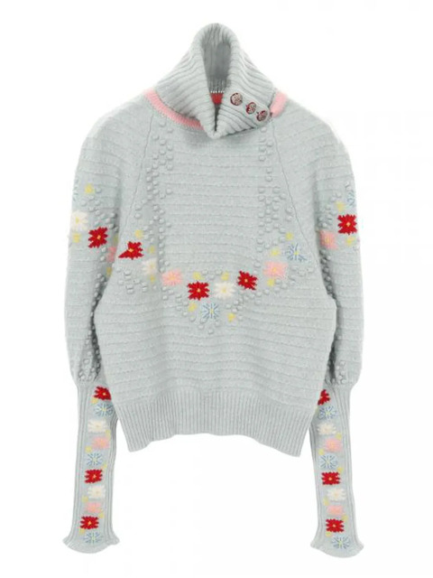 1986-1988 light blue floral intarsia knit buttoned cuffs turtleneck knitted construction bobble knit detail