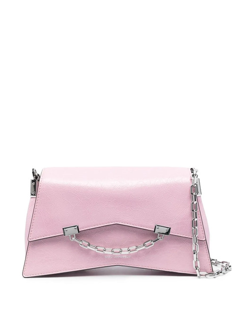 pink mist faux leather silver-tone logo lettering logo-embossed strap chain-link detailing chain-link shoulder strap silver-tone hardware foldover top with magnetic fastening partitioned compartment internal logo patch