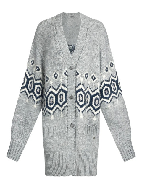 grey jacquard pattern v-neck puff sleeves side pockets bejewelled button closure