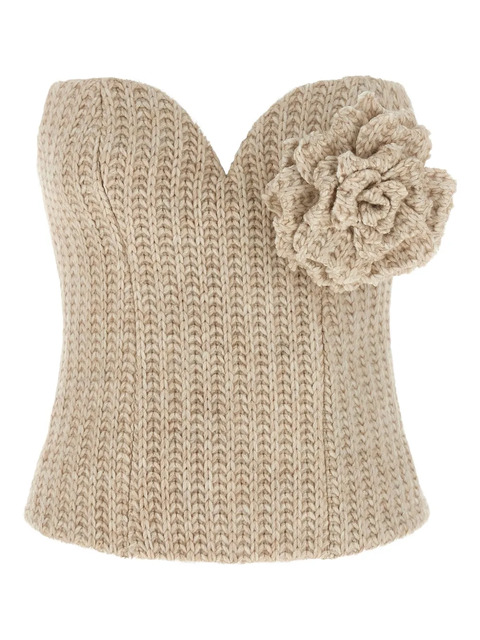 beige ribbed knit sweetheart neck flower embellishment zip fastening