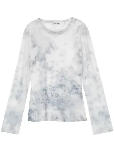 light grey mesh design semi-sheer construction abstract pattern print crew neck long sleeves straight hem