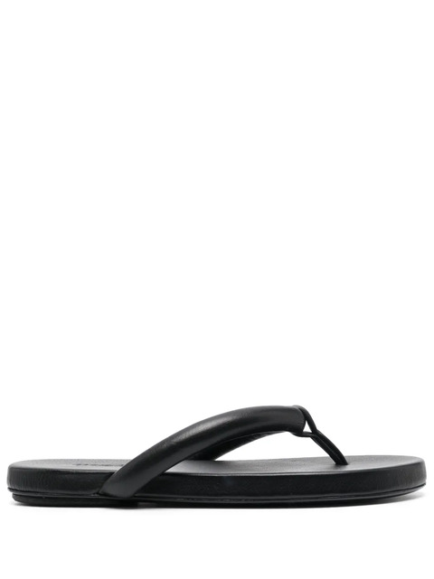 jet black calf leather smooth grain/grained texture thong strap branded insole open toe round toe slip-on style flat leather sole
