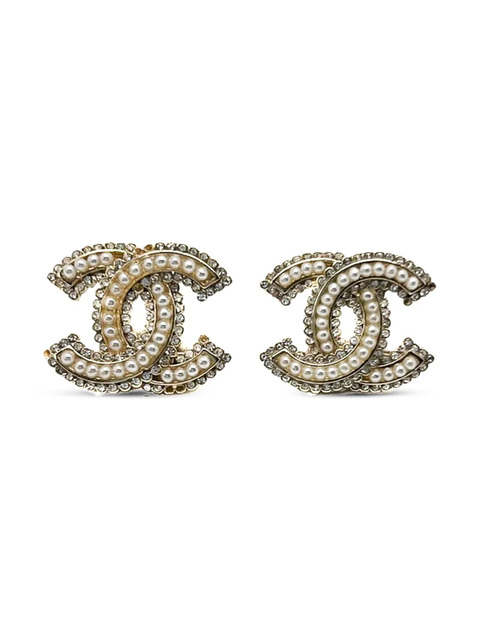 circa 2020s gold-tone gold plated polished finish faux-pearl embellishment glass crystal embellishment signature interlocking CC logo post-back fastening for pierced ears These earrings come as a pair. Condition: GOOD. This previously owned and used item is in good condition with minimal signs of use. This may include fading of material or plating and scratches.