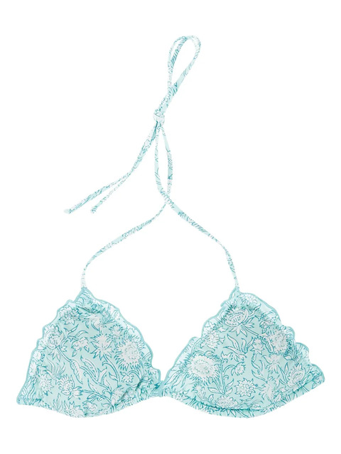 light blue floral pattern ruffled trim triangle cup lace closure Be mindful to try on swimwear over your own garments.