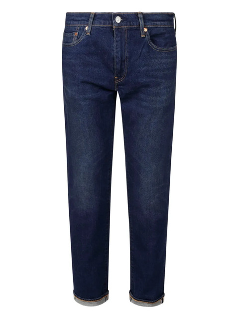 blue front button and zip fastening classic five pockets belt loops rear logo patch