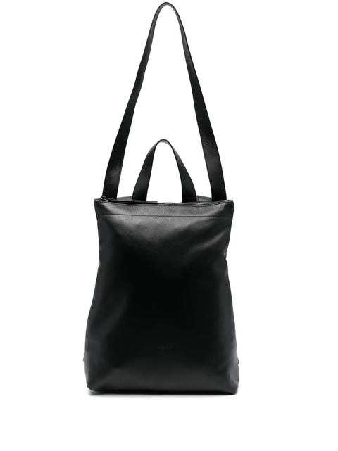 black calf leather tonal stitching debossed logo to the front top zip fastening single flat top handle adjustable shoulder strap main compartment internal zip-fastening pocket
