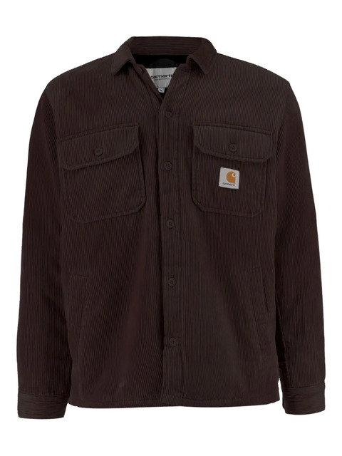 brown corduroy texture shirt collar logo patch button closure long sleeves