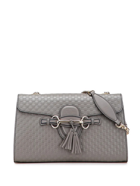 embossed leather body chain link strap with leather guard front flap with a slip-through closure tassel detail interior slip pockets gray Serial Number: 449635 568024 Inclusions: dust bag. Condition: EXCELLENT. This previously owned item is in near-perfect condition with no signs of damage or use. Please refer to the photos on this product page for a detailed view of the item, including any damages declared.