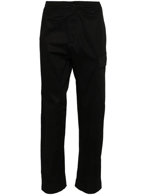 black stretch-cotton tonal stitching elasticated waistband with internal drawstring zip fly fastening two side slash pockets rear flap pocket side patch pocket logo patch to the side tapered leg
