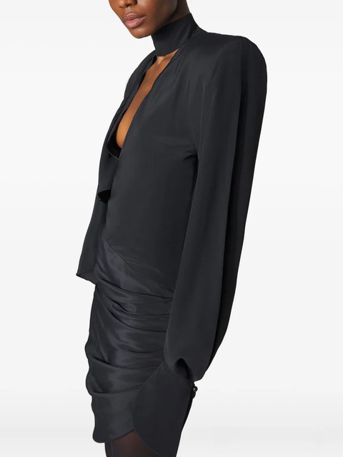 black high neck draped detailing padded shoulders long sleeves asymmetrical hem