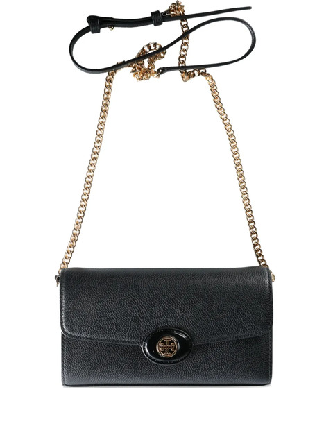 black gold-tone logo flap closure chain strap leather