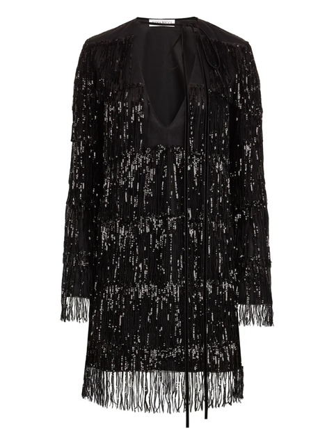 black sequin embellishment fringed detail V-neck long sleeves self-tie fastening
