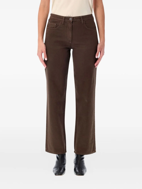brown five pockets belt loops tonal stitching rear logo detail button and zip fastening
