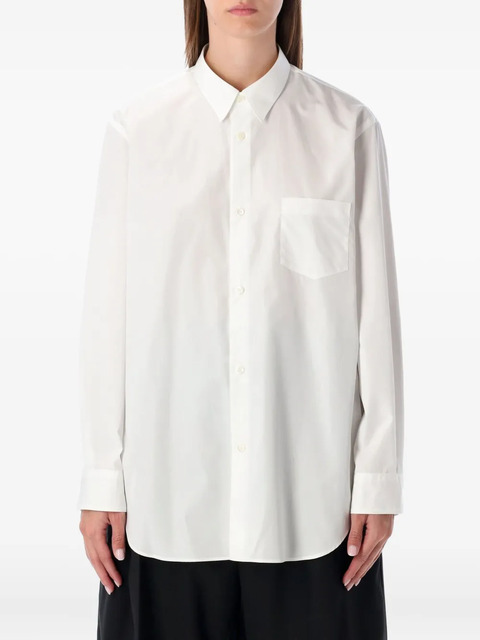 white button fastening chest pocket long sleeves buttoned cuffs curved hem