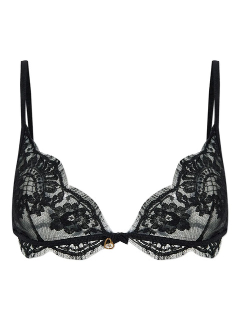 black floral lace heart charm adjustable straps hook fastening scalloped trim