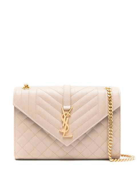 beige calf leather chain-link shoulder strap signature YSL logo plaque foldover top with magnetic fastening main compartment internal slip pocket quilted