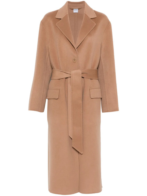 camel brown wool felted front button fastening notched collar long sleeves two front flap pockets side slits straight hem long length