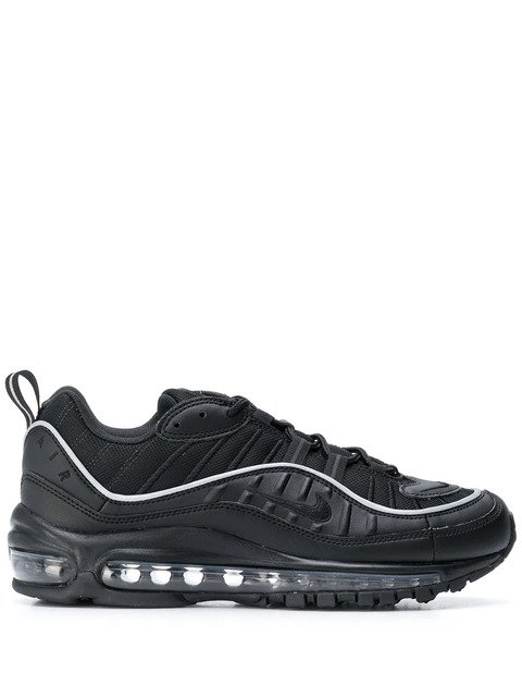 Black Air Max 98 sneakers from Nike featuring a round toe, a lace-up front fastening, embroidered details, a pull tab at the rear and a Foam midsole with responsive Max Air cushioning.